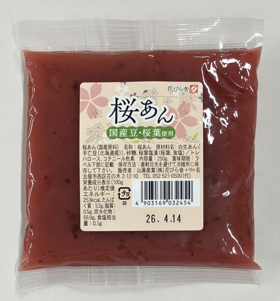 | 原材料 | 白生あん(手亡豆(北海道産))、砂糖、桜葉塩漬(桜葉、食塩)/トレハロース、コチニール色素 |